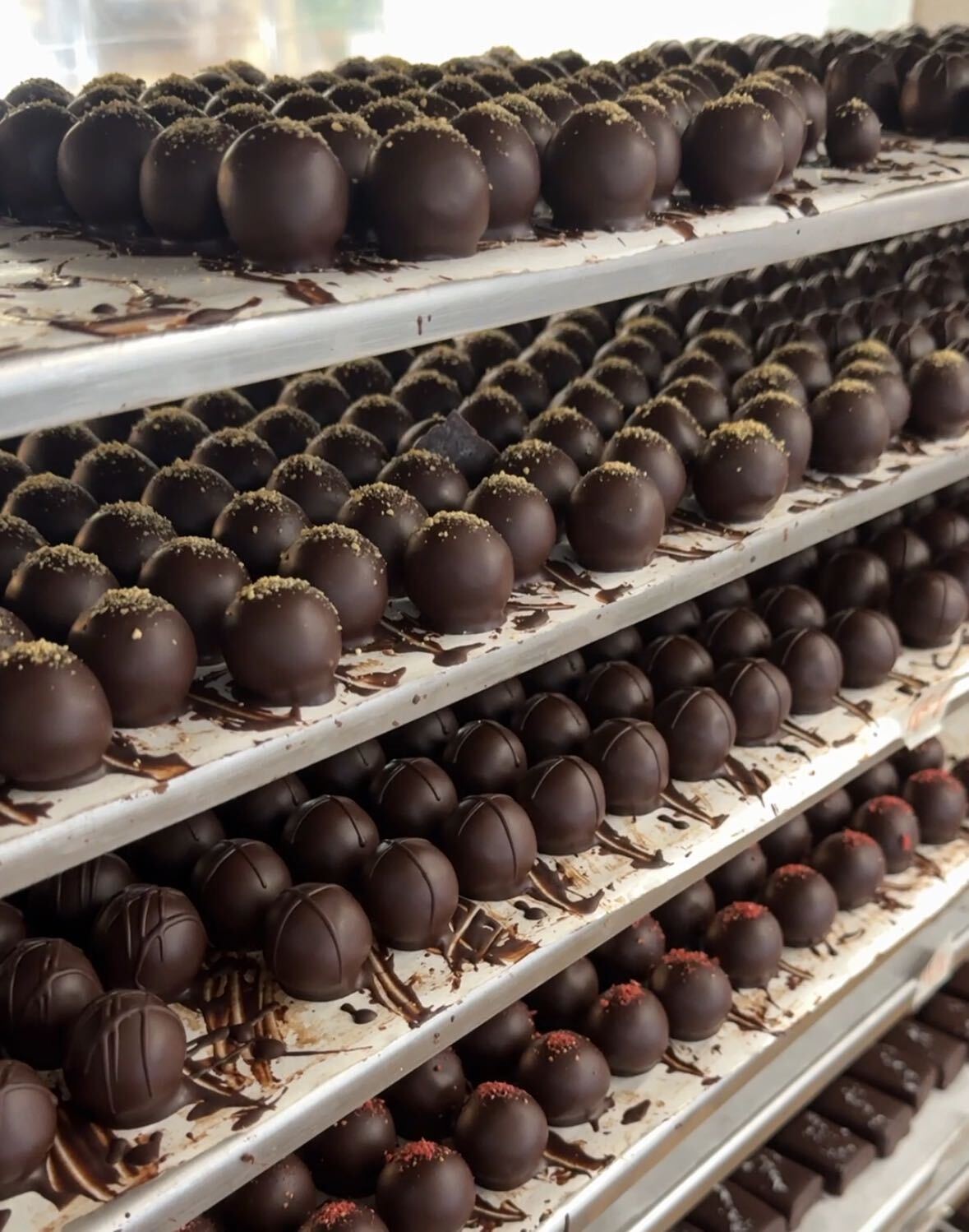 Each truffle begins with silky ganache made from 71% organic, direct trade dark chocolate and Vermont heavy cream, gently infused with hand-picked flavor accents. Then each piece is hand-dipped in the same deep-cocoa dark chocolate and finished with its own distinctive design.